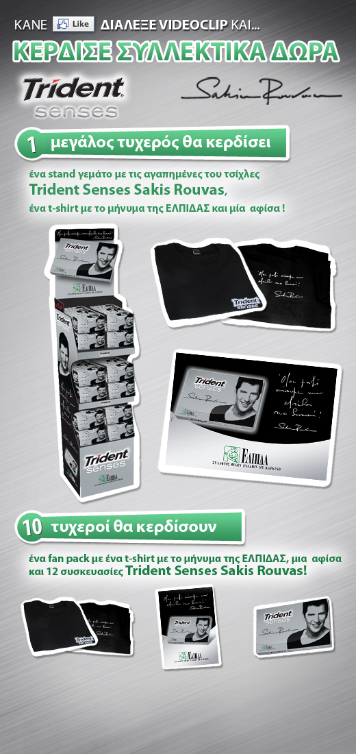- 1 μεγάλος τυχερός θα κερδίσει ένα stand με τις αγαπημένες του τσίχλες Trident Senses Sakis Rouvas, ένα t-shirt με το μήνυμα της ΕΛΠΙΔΑΣ και μία αφίσα