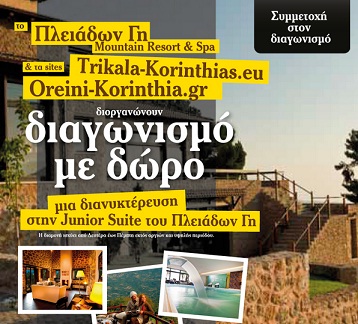 Η σελίδα Trikala Korinthias διοργανώνει διαγωνισμό και σας δίνει τη δυνατότητα να κερδίσετε μια διανυκτέρευση στη Junior Suite στο Πλειάδων Γη Spa Mountain Resort.