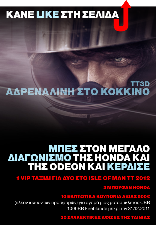 H ODEON σε συνεργασία με τη Honda διοργανώνουν το μεγάλο διαγωνισμό “Tt3d: Αδρεναλίνη στο κόκκινο” στο facebook και σας δίνουν την ευκαιρία να κερδίσετε ταξίδι, μπουφάν και εκπτωτικά κουπόνια!