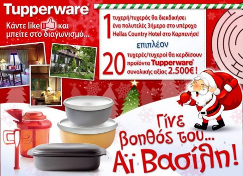 Η σελίδα Tupperware Greece διοργανώνει το διαγωνισμό «Γίνε βοηθός του…Άι Βασίλη» και δίνει τη δυνατότητα σε 1 τυχερό να κερδίσει ένα ταξίδι στο Hellas Country Hotel στο Καρπενήσι για 2 διανυκτερεύσεις σε δίκλινο δωμάτιο με πρωινό και σε 20 ακόμα νικητές να κερδίσουν 10 προϊόντα Tupperware.