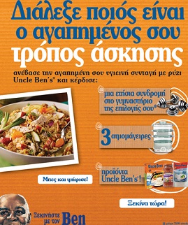 Η σελίδα Uncle Ben’s Greece διοργανώνει διαγωνισμό και δίνει τη δυνατότητα σε ένα τυχερό να κερδίσει μία συνδρομή σε γυμναστήριο επιλογής του ή σε οποιοδήποτε άλλο είδος άθλησης αυτός επιλέξει, μέχρι του ποσού των τριακοσίων πενήντα Ευρώ (350€) ετησίως συμπεριλαμβανομένου του ΦΠΑ και σε 3 ακόμα, να κερδίσουν 3 ατμομάγειρες Tefal. Επιπλέον 3 τυχεροί κάθε εβδομάδα θα κερδίζουν προϊόντα Uncle Ben.