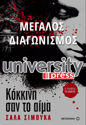 Η University Press σε συνεργασία με τις εκδόσεις Μεταίχμιο προσφέρει τρία αντίτυπα του μυθιστορήματος της Σάλα Σίμουκα “Η ΤΡΙΛΟΓΙΑ ΤΗΣ ΧΙΟΝΑΤΗΣ – ΚΟΚΚΙΝΗ ΣΑΝ ΤΟ ΑΙΜΑ” από τις εκδόσεις ΜΕΤΑΙΧΜΙΟ.