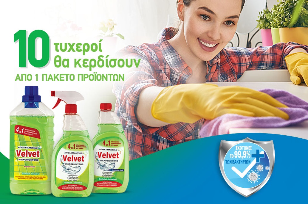 Η Velvet Disinfectants διοργανώνει διαγωνισμό και δίνει τη δυνατότητα σε 10 τυχερούς να κερδίσουν από ένα πακέτο με τα παρακάτω προϊόντα: