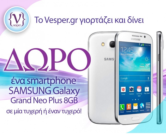 To Vesper.gr διοργανώνει διαγωνισμό και σας δίνει τη δυνατότητα να κερδίσετε ένα smartphone Samsung Galaxy Grand Neo Plus 8GB!