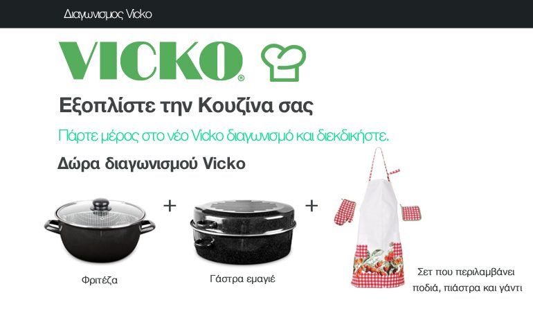 Η Vicko σας βοηθά να εξοπλίσετε την κουζίνα σας! Πάρτε μέρος στο νέο Vicko διαγωνισμό και διεκδικήστε μια φριτέζα και μια γάστρα εμαγιέ καθώς και ένα σετ που περιλαμβάνει ποδιά, πιάστρα και γάντι για να αποφύγετε τα ατυχήματα στην κουζίνα.