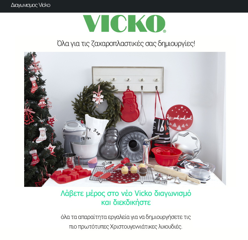 Το vicko διοργανώνει διαγωνισμό και σας δίνει τη δυνατότητα να κερδίσετε όλα τα απαραίτητα σκεύη και εργαλεία για να δημιουργήσετε τις πιο πρωτότυπες Χριστουγεννιάτικες λιχουδιές.