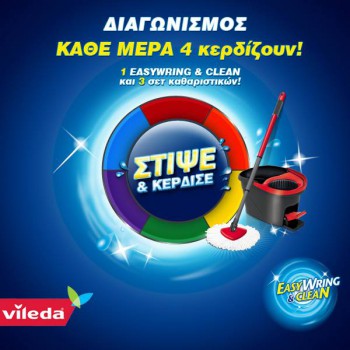 Η σελίδα Vileda Greece διοργανώνει διαγωνισμό και δίνει τη δυνατότητα σε 4 νικητές να κερδίσουν κάθε μέρα το νέο σύστημα σφουγγαρίσματος Vileda EasyWring & Clean και άλλα πλούσια δώρα!
