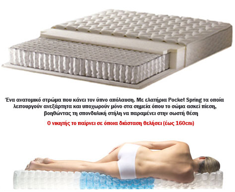 Με ελατήρια Pocket Spring τα οποία λειτουργούν ανεξάρτητα και υποχωρούν μόνο στα σημεία όπου το σώμα ασκεί πίεση, βοηθώντας τη σπονδυλική στήλη να παραμένει στην σωστή θέση. Επίσης, διαθέτει μοναδική τεχνολογία για μεγάλες διαστάσεις που εμποδίζει την μετάδοση της κίνησης, σε περιπτώσεις όπου η διαφορά σωματικού βάρους μεταξύ του ζευγαριού είναι μεγάλη.