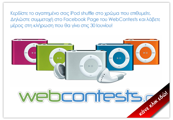 Το webcontests.gr διοργανώνει διαγωνισμό στο facebook και σας δίνει τη δυνατότητα να κερδίσετε ένα iPod Shuffle στο χρώμα που εσείς επιθυμείτε!