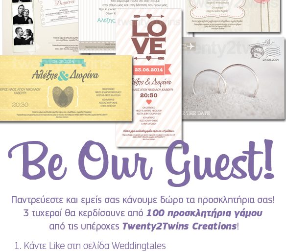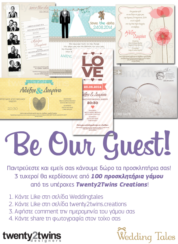 Το weddingtales.gr διοργανώνει διαγωνισμό και σας δίνει τη δυνατότητα να κερδίσετε 100 προσκλητήρια γάμου για 3 τυχερά ζευγάρια από τις μοναδικές δημιουργίες των κοριτσιών της Twentytwins.creations!