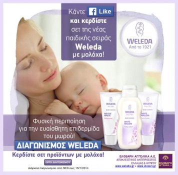 Η σελίδα Weleda Greece διοργανώνει διαγωνισμό και δίνει τη δυνατότητα σε κάθε εβδομάδα σε 2 τυχερές μανούλες να κερδίσουν 2 σετ περιποίησης με Μολόχα (κρέμα αλλαγής πάνας, γαλάκτωμα σώματος και κρέμα προσώπου).