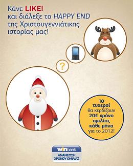 Η winbank διοργανώνει διαγωνισμό και σας δίνει τη δυνατότητα, διαλέγοντας το “happy end” της χριστουγεννιάτικης ιστορίας, να κερδίστε το χρόνο ομιλίας σας για το 2012! 10 τυχεροί κερδίζουν από 20 ευρώ χρόνο ομιλίας κάθε μήνα για το 2012!