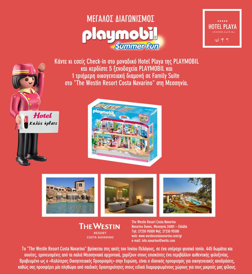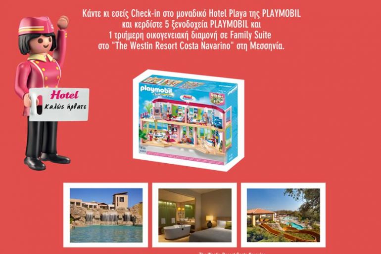 Η σελίδα PLAYMOBIL διοργανώνει διαγωνισμό και σας δίνει τη δυνατότητα να κερδίσετε 5 ξενοδοχεία και 1 τριήμερη οικογενειακή διαμονή σε Family Suite στο “The Westlin Resort Costa Navarino” στη Μεσσηνία.