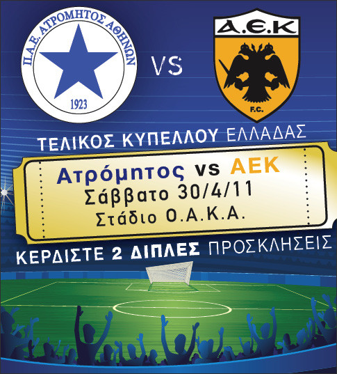 Ο Χρυσός Οδηγός διοργανώνει διαγωνισμό και σας δίνει τη δυνατότητα να κερδίστε διπλές προσκλήσεις για τον αγώνα Ατρόμητος – ΑΕΚ για το Σάββατο 30/4/2011!