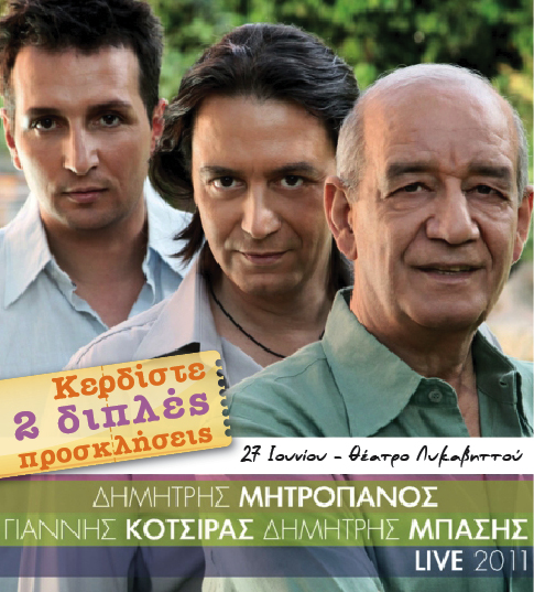 O Χρυσός Οδηγός διοργανώνει νεό διαγωνισμό και σας δίνει τη δυνατότητα να κερδίσετε 2 εισιτήρια για τη συναυλία των Μητροπάνου, Κότσιρα, Μπάση στις 27 Ιουνίου 2011 στο θέατρο Λυκαβηττού!