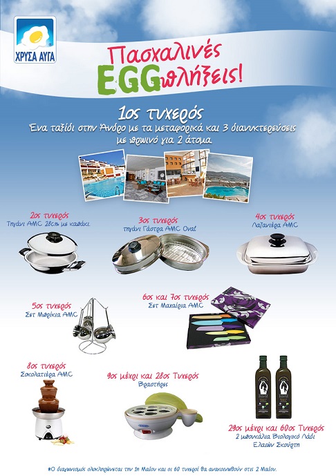 Η σελίδα Χρυσά Αυγά διοργανώνει διαγωνισμό και δίνει τη δυνατότητα σε 1 τυχερό να κερδίσει 1 ταξίδι στην Άνδρο για 2 άτομα και σε 60 ακόμα τυχερούς να κερδίσουν πλούσια δώρα.