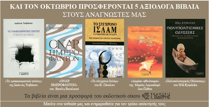 Για τον μήνα Οκτώβριο οι αναγνώστες μας μπορούν να διεκδικήσουν τα εξής βιβλία, τα οποία είναι μια προσφορά του εκδοτικού οίκου «Ι.Σιδέρης»: