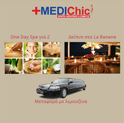 Η Medichic διοργανώνει διαγωνισμό και σας δίνει τη δυνατότητα να κερδίσετε One day spa σε ένα που περιλαμβάνει double massage με σοκολατοθεραπεία, και μια περιποίηση προσώπου για 2 άτομα στα καταστήματα Μedichic σε Άγιο Δημήτριο, Γλυφάδα, Κηφισιά, Αρτέμιδα αλλά και ένα super δείπνο στο “la Βanane beach bar Voula”!
