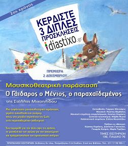 Το diastixo.gr, σε συνεργασία με τις εκδόσεις Εν πλω, προσφέρει στους αναγνώστες του 3 διπλές προσκλήσεις, για το θεατρικό έργο της Στέλλας Μιχαηλίδου «O γάιδαρος ο Μένιος, ο παραχαϊδεμένος», την Κυριακή 2 Δεκεμβρίου στις 11:30 στην Αίθουσα Τέχνης στη Στοά του Βιβλίου (Πεσμαζόγλου 5 και Σταδίου, Αθήνα).