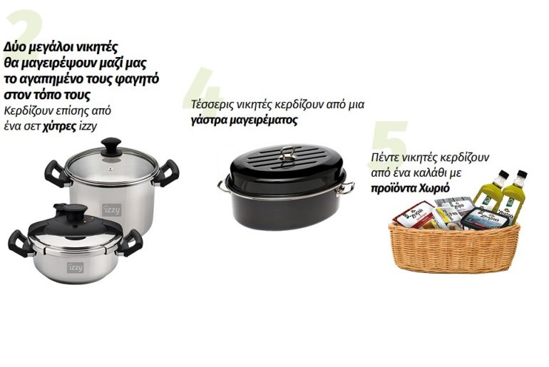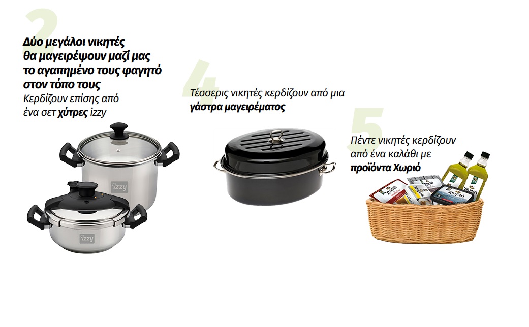 – 1 νικητής θα κερδίσει 1 σετ χύτρες ταχύτητας Izzy (2τμχ) και την ευκαιρία να μαγειρέψει με το Χωριό τη συνταγή του στον τόπο του.