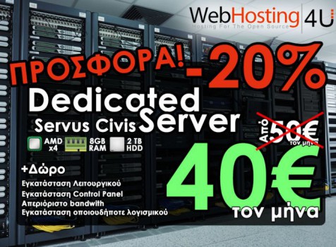 Άλλο ένα εκπτωτικό κουπόνι της webhosting4u.gr. Αυτήν την φορά σας δίνουμε την ευκαιρία να αποκτήσετε dedicated server με έκπτωση 20% στην τιμή ανα μήνα. Το εκπτωτικό κουπόνι αφορά τον dedicated server Servus Civis.