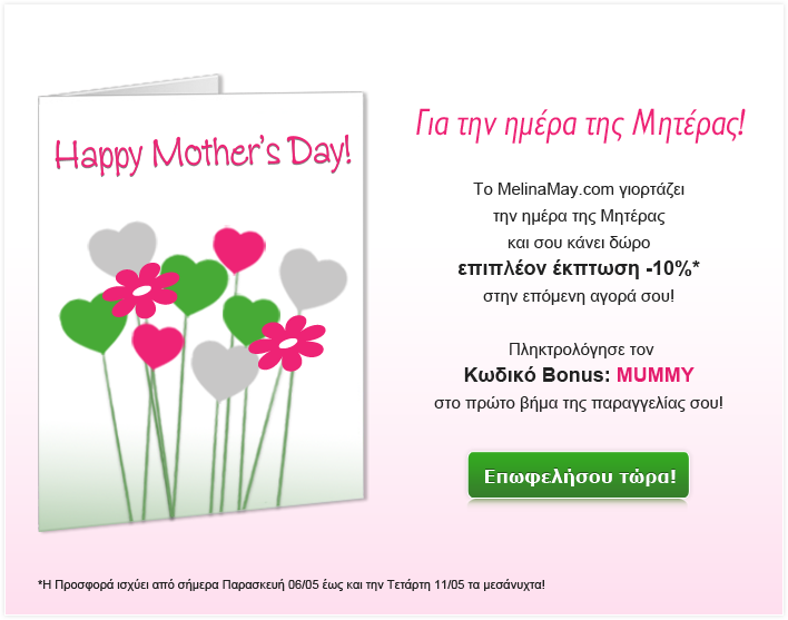 Το MelinaMay.com γιορτάζει την ημέρα της Μητέρας και σου κάνει δώρο επιπλέον έκπτωση -10% στην επόμενη σου αγορά!