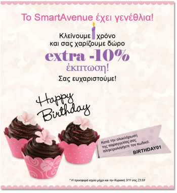 Στο Smart Avenue έχουμε Γενέθλια και το γιορτάζουμε με extra -10% έκπτωση σε όλους εσάς για τις αγορές σας!