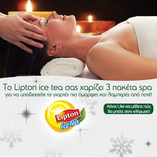 To Lipton Ice Tea σας χαρίζει 3 πακέτα spa για να υποδεχθείτε τις γιορτές πιο όμορφες και λαμπερές από ποτέ! Κάντε like στη fan page του Lipton Ice Tea, γράψτε στο ειδικό tab πού περάσατε τα πιο ονειρεμένα Χριστούγεννα και μπείτε στην κλήρωση!