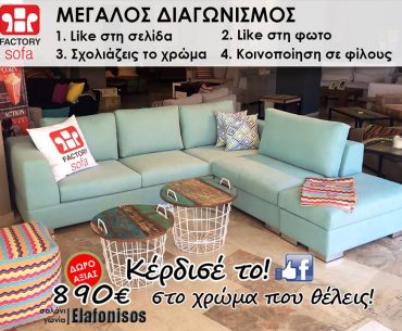 To FACTORY Sofa διοργανώνει διαγωνισμό και σας δίνει τη δυνατότητα να κερδίσετε ένα σαλόνι Elafonisos, ελληνικής κατασκευής με αδιάβροχο-αλέκιαστο ύφασμα, στο χρώμα που σας αρέσει!