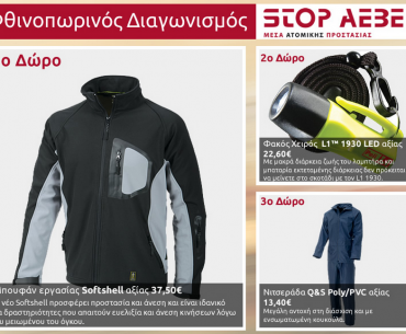 Η σελίδα STOP Α.Ε.Β.Ε διοργανώνει διαγωνισμό και σας δίνει τη δυνατότητα να κερδίσετε ένα μπουφάν εργασίας Softshell Q&S αξίας 37,50€, ένα φακό χειρός L1™ 1930 LED αξίας 22,60€ και μία νιτσεράδα Q&S Poly/PVCαξίας 13,40 €!