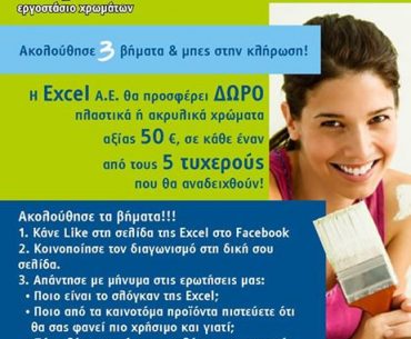 Η σελίδα Excel A.E. εργοστάσιο χρωμάτων διοργανώνει διαγωνισμό και δίνει τη δυνατότητα σε 5 τυχερούς να κερδίσουν πλαστικά ή ακρυλικά χρώματα αξίας 50 ευρώ!
