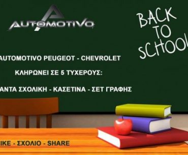 Η Automotivo Peugeot Chevrolet διοργανώνει διαγωνισμό και κληρώνει σε 5 τυχερούς τσάντα – κασετίνα – σετ γραφής εν όψη της νέας σχολικής χρονιάς και σε ένα τυχερό ακόμα δωρεάν αλλαγή λαδιών και τεχνικό έλεγχο 21 σημείων!