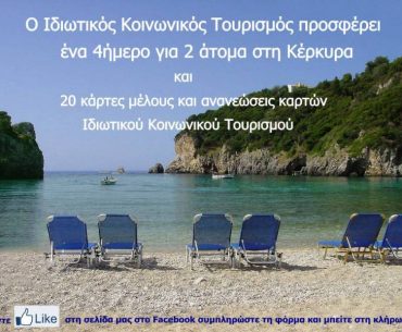 Ο Ιδιωτικός Κοινωνικός Τουρισμός www.ikt.gr διοργανώνει διαγωνισμό και σας δίνει τη δυνατότητα να κερδίσετε ένα 4ήμερο για 2 άτομα στην Κέρκυρα στο Kostas Apartments και 20 κάρτες μέλους Ιδιωτικού Κοινωνικού Τουρισμού!