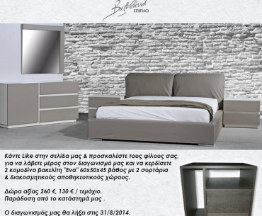 Η σελίδα Vaxevanis.gr διοργανώνει διαγωνισμό και σας δίνει τη δυνατότητα να κερδίσετε 2 κομοδίνα βακελίτη “Eva” 60x50x45 βάθος με 2 συρτάρια & διακοσμητικούς αποθηκευτικούς χώρους. Δώρα αξίας 260 €, 130 € /τεμάχιο.