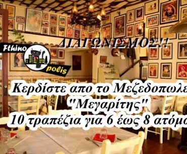 Το fthinopolis.gr διοργανώνει διαγωνισμό και δίνει τη δυνατότητα να σε 10 άτομα να κερδίσουν από 1 τραπέζι για 6 έως 8 άτομα, με όλα τα φαγητά πληρωμένα για την Κυριακή το μεσημέρι στις 25 Μαΐου 2014!