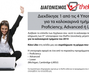 Το thepro.gr διοργανώνει διαγωνισμό και σας δίνει τη δυνατότητα να κερδίσετε 4 υποτροφίες για καλοκαιρινά μαθήματα Αγγλικών συνολικής μέγιστης αξίας 2.400€!