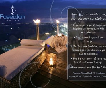 Το poseidonhotel.com.gr διοργανώνει διαγωνισμό και δίνει τη δυνατότητα σε έναν νικητή να κερδίσει πλούσια δώρα συνολικής αξίας 700 ευρώ: 1 διαμονή για 2 άτομα σε δωμάτιο με προνομιακή θέα θάλασσα, απολαυστικό πρωινό για 2 άτομα, 1 δωρεάν ξαπλώστρα στην παραλία του ξενοδοχείου για όλο το καλοκαίρι, ένα δείπνο στην ταβέρνα του ξενοδοχείου για 2 άτομα και free cocktail στο sky bar 360″.