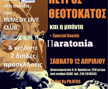 Το Remedy Live Club διοργανώνει διαγωνισμό και σας δίνει τη δυνατότητα να κερδίσετε 2 διπλές προσκλήσεις για τη συναυλία του Πέτρου Θεοτοκάτου το Σάββατο 12 Απριλίου.