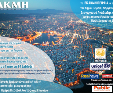 Το ΙΕΚ ΑΚΜΗ ΠΕΙΡΑΙΑ σε συνεργασία με το Δήμο Πειραιά διοργανώνει Μεγάλο Διαγωνισμό Ανάδειξης του Πειραιά ενόψει της ανακήρυξής του ως Ναυτικής Πρωτεύουσας της Ευρώπης 2015 και χαρίζει 14 υπέροχα tablets, προσφορά των καταστημάτων Public.