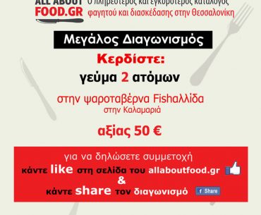 Το allaboutfood.gr διοργανώνει διαγωνισμό και σας δίνει τη δυνατότητα να κερδίσετε ένα γεύμα 2 ατόμων στην ψαροταβέρνα Fishαλλίδα στην Καλαμαριά αξίας 50€!