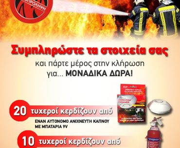 Η Πυροπρόληψη διοργανώνει διαγωνισμό και σας δίνει τη δυνατότητα να κερδίσετε 30 μοναδικά δώρα πυροπροστασίας: 20 αυτόνομους ανιχνευτές καπνού και 10 φορητούς πυροσβεστήρες.