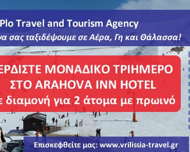 Το Air & Plo Travel διοργανώνει διαγωνισμό και σας δίνει τη δυνατότητα να κερδίσετε ένα τριήμερο στην Αράχωβα, στο ARAHOVA INN με πρωινό για 2 άτομα σε δίκλινο δωμάτιο, για το τριήμερο της 25ης Μαρτίου.