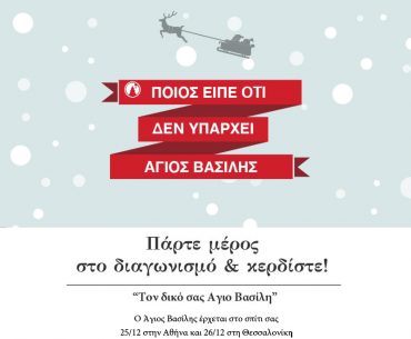 Πάρτε μέρος στο διαγωνισμό των ζαχαροπλαστείων Κωνσταντινίδης και κερδίστε το δικό σας Άγιο Βασίλη. Ο Άγιος Βασίλης έρχεται το σπίτι σας, στην Αθήνα στις 25/12 και στη Θεσσαλονίκη στις 26/12 με τον σάκο του γεμάτο με γλυκά και δώρα! Ίσως είστε εσείς ένας από τους εφτά τυχερούς!