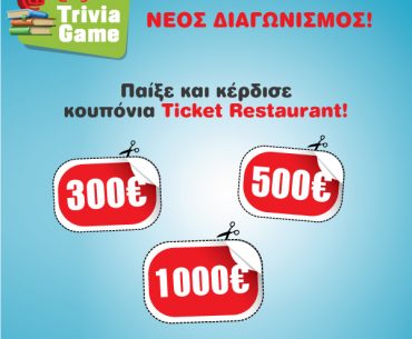Η Anytime Online σας καλεί στο «ANYTIME TRIVIA GAME» και σας δίνει τη δυνατότητα να κερδίσετε καθημερινά κουπόνια Ticket Restaurant αξίας 300€ ενώ στο τέλος του παιχνιδιού 1 τυχερός θα κερδίσει 500€ και άλλος ένας 1000€.