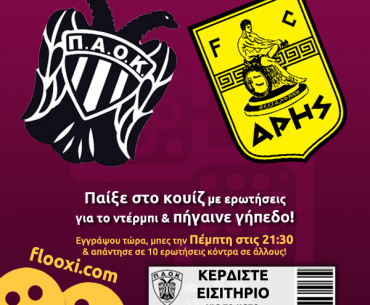 Εγγραφείτε τώρα στο δωρεάν κουίζ “ΠΑΟΚ-ΑΡΗΣ ποδόσφαιρο” του flooxi.com και παίξτε αύριο 21/11 στις 21:30 για να διεκδικήσετε ένα εισιτήριο για τον αγώνα ποδοσφαίρου της Κυριακής ΠΑΟΚ-ΑΡΗΣ!