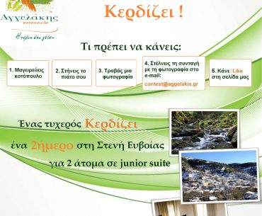 Η σελίδα Αγγελάκης κοτόπουλα διοργανώνει διαγωνισμό και σας δίνει τη δυνατότητα να κερδίσετε ένα διήμερο στη Στενή Ευβοίας για δύο άτομα σε junior suite!