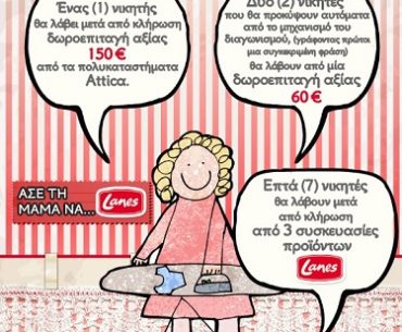Η σελίδα Lanes διοργανώνει διαγωνισμό και σας δίνει τη δυνατότητα να κερδίσετε 1 δωροεπιταγή αξίας 150 ευρώ από τα Attica, 2 δωροεπιταγές αξίας 60 ευρώ από τα Attica και 3 συσκευασίες προϊόντων Lanes σε ακόμα 7 τυχερούς.