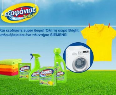 Το Εύρηκα διοργανώνει διαγωνισμό και σας δίνει τη δυνατότητα να κερδίσετε 12 σετ προϊόντων Εύρηκα Bright και ένα μπλουζάκι, ενώ ένας υπερτυχερός νικητής θα κερδίσει ένα σετ προϊόντων Εύρηκα Bright και ένα πλυντήριο ρούχων.