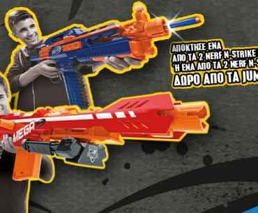 Το Jumbo διοργανώνει διαγωνισμό και σας δίνει τη δυνατότητα να κερδίσετε 2 εκτοξευτές NERF N-STRIKE ELITE CENTURION MEGA, αξίας €59,99, με αναδιπλούμενο δίποδο και ΜΕGA Darts για MEGA αποστάσεις ή 2 αυτόματους NERF N-STRIKE ELITE RAPIDSTRIKE, αξίας €49,99, για ταχύτερη εκτόξευση 4 Darts ανά δευτερόλεπτο!