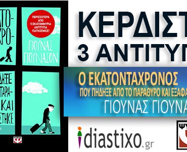 Το diastixo.gr σε συνεργασία με τις εκδόσεις Ψυχογιός, προσφέρει στους αναγνώστες του 3 αντίτυπα από το μυθιστόρημα του Γιούνας Γιούνασον Ο ΕΚΑΤΟΝΤΑΧΡΟΝΟΣ ΠΟΥ ΠΗΔΗΞΕ ΑΠΟ ΤΟ ΠΑΡΑΘΥΡΟ ΚΑΙ ΕΞΑΦΑΝΙΣΤΗΚΕ.